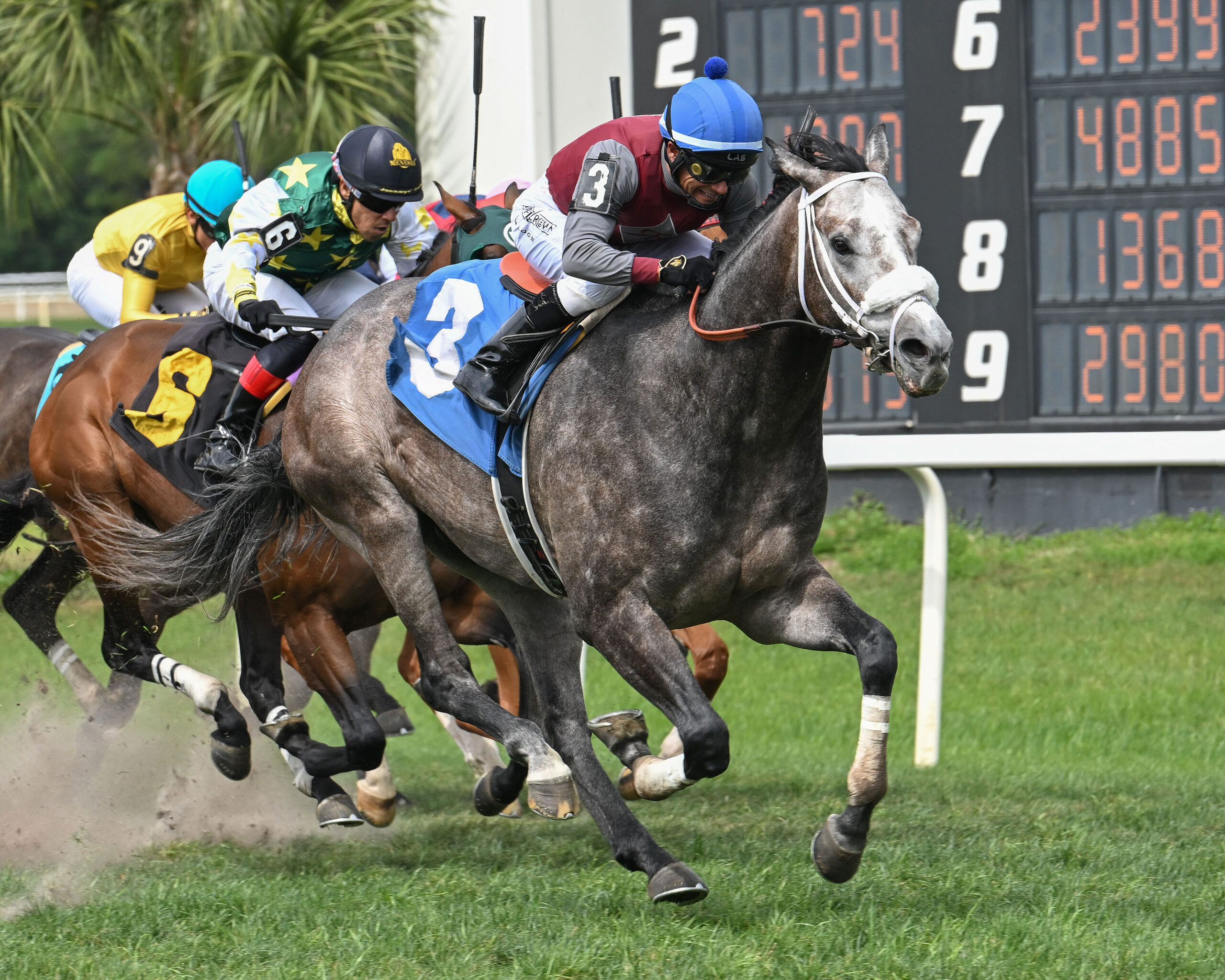 Ray’s Approval, winner of the Grade 3 Robert F. Carey Memorial Handicap at Hawthorne the previous July, raced a length-and-a-half in front of Band is Passing and jockey Eibar Coa in second through a half mile in :47.63 on the firm turf. Band is Passing went by his fellow Florida-bred in the far turn then separated from the field in the run for home to win by two-and-three-quarters lengths in 1:40.11. Hibernian Rhapsody was second with Shamrock City third.